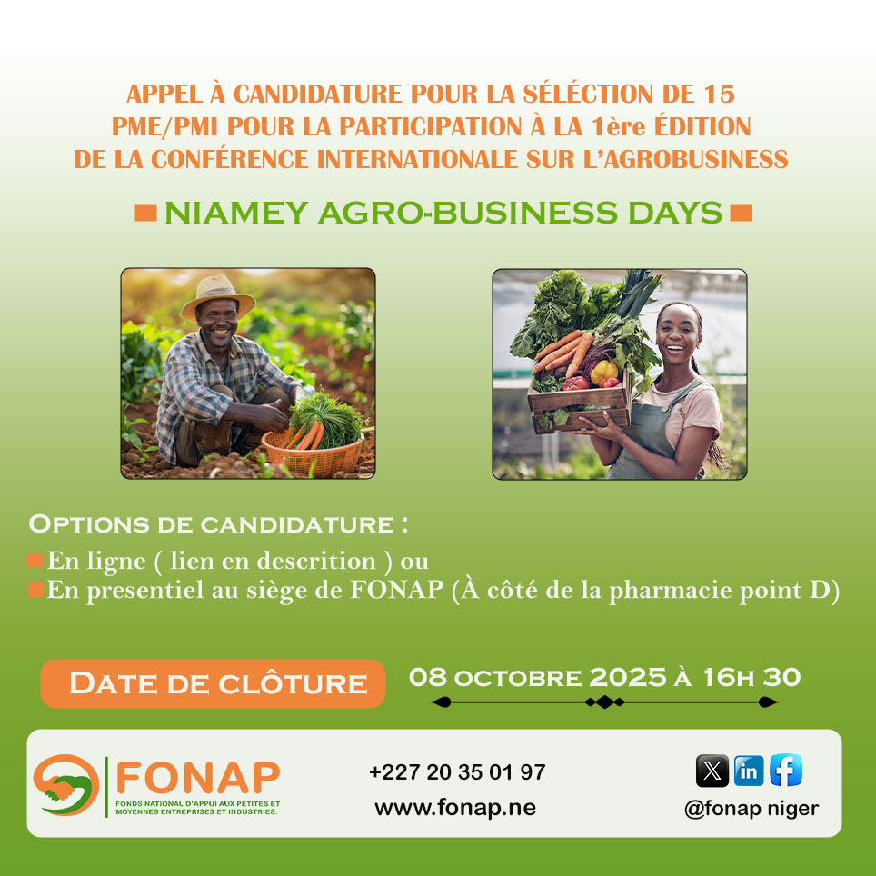 La participation du FONAP et des PME/PMI accompagnés s'inscrit donc dans une logique de valorisation du potentiel économique et commercial des entreprises locales, tout en colidant le positionnement du FONAP comme un partenaire stratégique du dévelloppement des PME/PMI au Niger. Cette participation du FONAP et PME/PMI accompagnés à la Conférence Internationale NIAMEY AGROBUSINESS DAYS répresente une opportinuté unique de stimuler l'intéressement, l'investissement et l'innovation dans l'agro-business nigérien, notament par la jeunesse, de renforcement des capacités, d'accroissement de la visibilité des entreprises locales et d'optimisation des opportinutés de croissance et de développement économique.